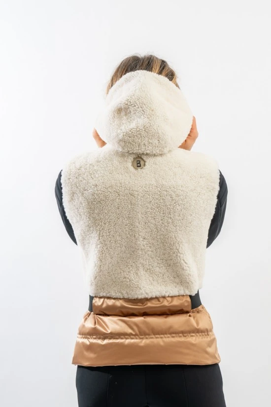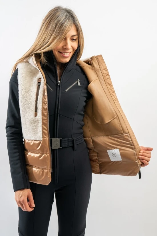 Katia è il gilet raffinato e funzionale firmato Bogner. Prezioso e pratico si compone di un mix di materiali pregiati e moderni. La pelle d’agnello riccia e morbida incontra la luminosità delle parti trapuntate. La cintura in vita valorizza la figura e garantisce una perfetta aderenza. Pratico e d’effetto è il complemento ideale per un après-ski di classe che non passa inosservato.