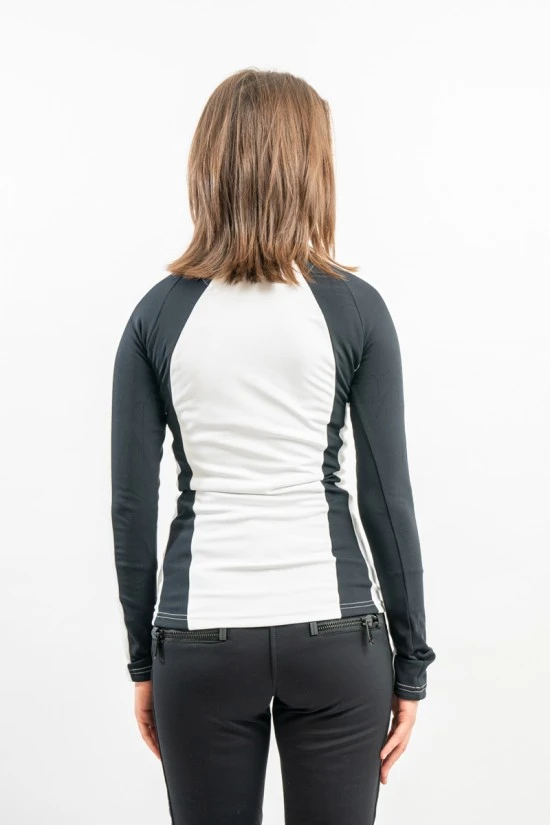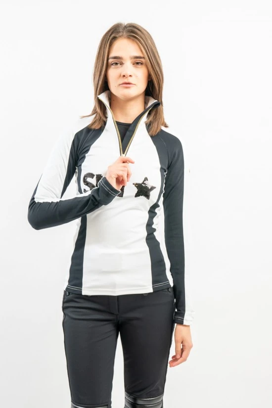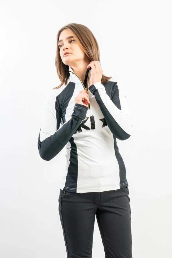 Sottotuta mezza zip in tessuto elasticizzato e traspirante. Impreziosito dagli inserti in tessuto cangiante, dalla zip dorata e dalla applicazione di pailettes reversibili oro/nero. Costruito con tecnologia Silvadur ad azione antibatterica. Vestibilità slim. Morbido e leggero adatto a tutti gli sport all’aria aperta.