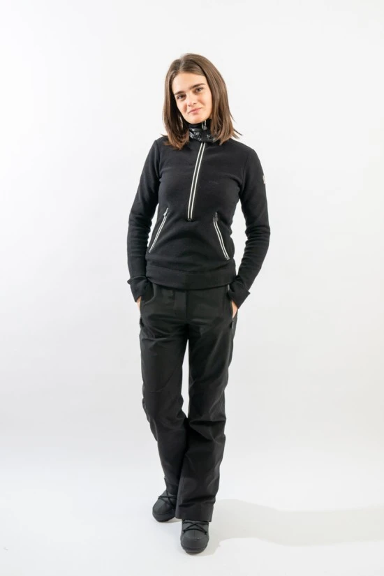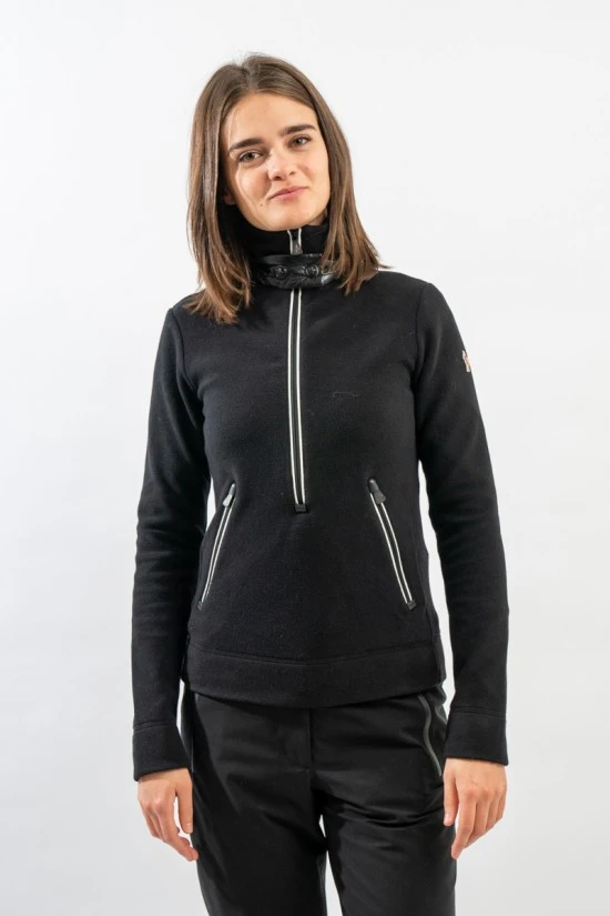 Maglia a collo alto con mezza zip realizzata in pile stretch polar, pensata per offrire calore e protezione sulle piste da sci e nel tempo libero. Antivento e traspirante, impreziosita dai dettagli del collo in nylon laqué e dalle zip waterproof. Vestibilità slim fit.