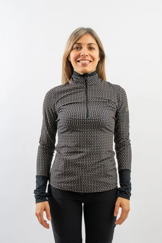 Sottotuta mezza zip in stampa mini logo, realizzato in micro pile elastico. Traspirante e caldo. I dettagli a contrasto e la realizzazione del logo in cristalli di Swarovski lo impreziosiscono. Ideale per praticare sport all’aperto o come sotto giacca.
