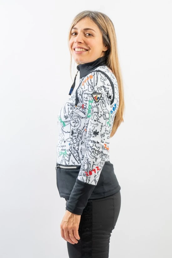 Celebrativo dei 20 anni di collaborazione con lo stilista Jean-Charles de Castelbajac, il sottotuta Climi ne rappresenta appieno la creatività. La stampa grafica è divertente e vivace. Full zip con collo in piedi. Caldo è foderato in morbido pile e la fascia elastica al fondo aderisce perfettamente trattenendo al meglio il calore. Ideale sotto la giacca da sci o per praticare ogni sport all’aperto.