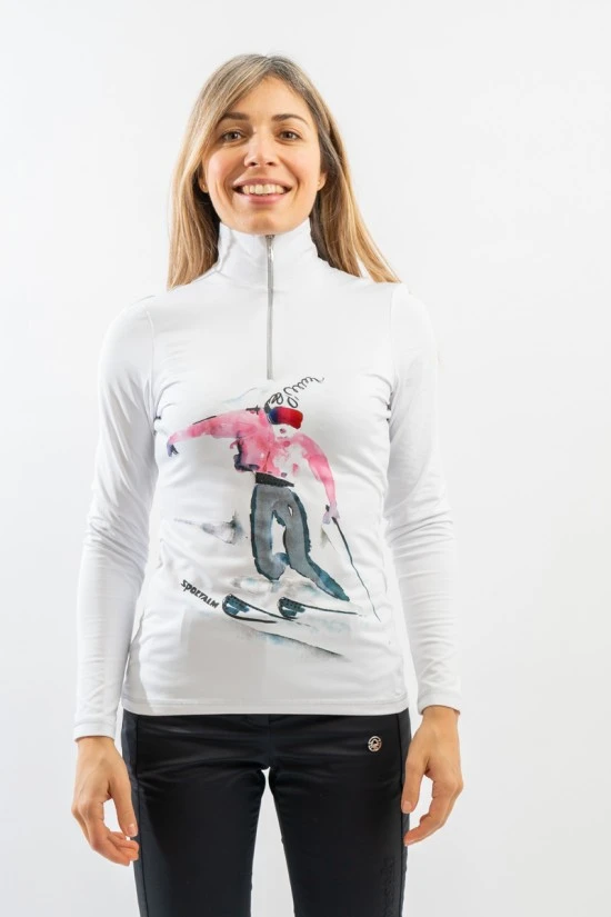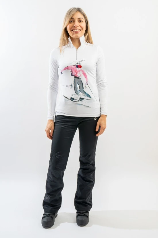 Sottotuta mezza zip realizzato in tessuto elasticizzato con stampa sul davanti e jersey in argento metallizzato dietro. Arricchito dalle cuciture esterne in filo silver e dalle stampe 3D è vivace ed originale. Microfelpato all’interno è caldo e traspirante. Ideale sotto la giacca da sci.