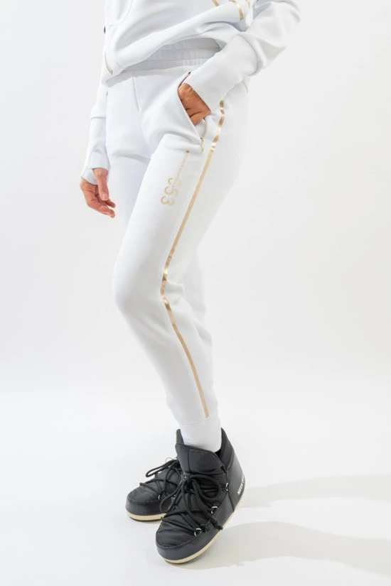 Pantalone sportivo realizzato in tessuto elasticizzato e felpato firmato Sportalm. Caldo e traspitante. Dotato di due tasche laterali chiuse da zip a filo. Arricchito dall’inserto dorato stampato sulla lunghezza e dalla stampa a contrasto sulla gamba. Vita elasticizzata e polsini al fondo. Funzionale e confortevole, è ideale per praticare sport all’aria aperta.
