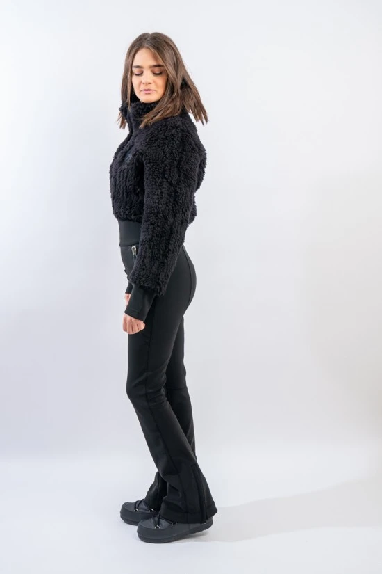 Tuta intera Eva firmata Toni Sailer. Realizzata con un mix di materiali sofisticati e funzionali. La parte superiore in lana vergine, lavorata ad effetto orsacchiotto, si fonde con la parte inferiore realizzata in Schoeller Svizzero, elasticizzato, idrorepellente ed antivento. Il collo in piedi e l’interno completamente foderato, offrono una sensazione di piacevole calore e morbidezza. A completare il capo le zip metallic look e la luminosità del tessuto. Moderna e pratica è un Must have per l’inverno 2022-23, per affrontare con stile ogni pista.