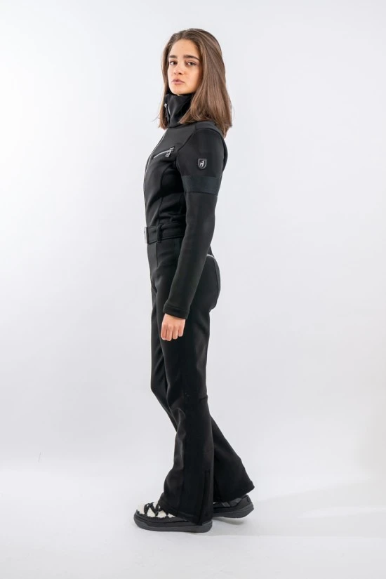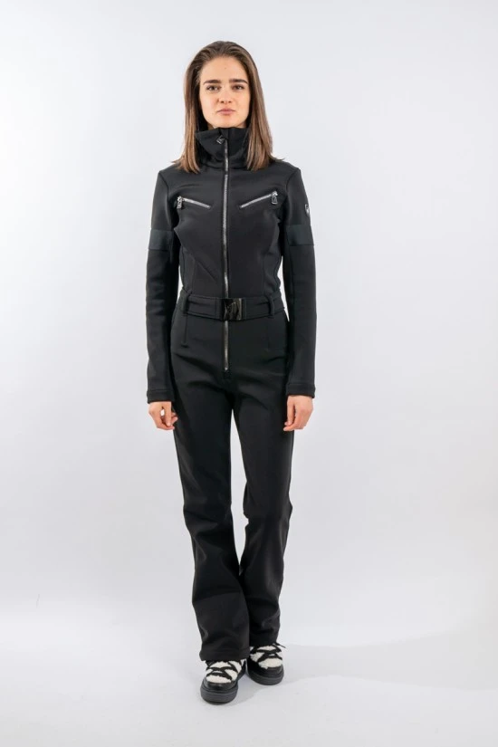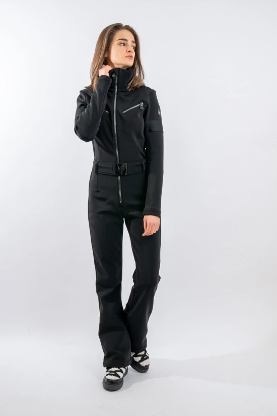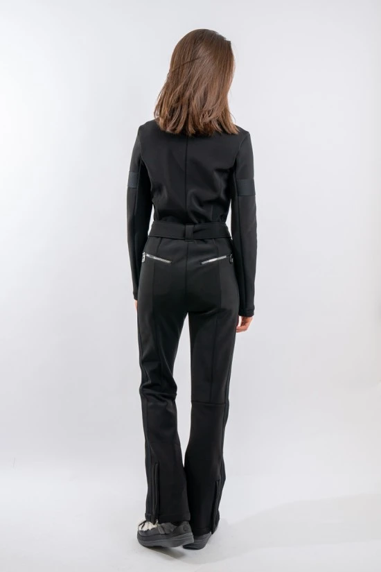 Tuta intera in tessuto felpato 4-way stretch con fascia elasticizzata lungo il fianco che si prolunga fino al fondo. Importante cintura in vita con fibia loggata. Impreziosita dalle zip gioiello sul davanti e sulle tasche posteriori. Logo istituzionale cucito sulla manica. Must have per l’inverno 2020-21.