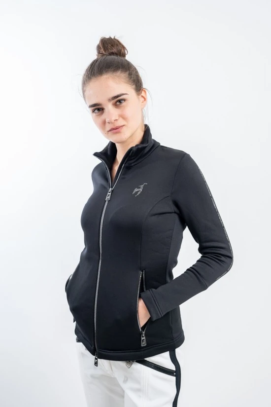 Sottotuta full zip in tessuto elasticizzato. Arricchito da strisce in lourex lungo le maniche per un effetto chic. Zip gioiello doppio cursore. Logo istituzionale in cristalli Swarowski applicato sul petto. Ideale da indossare da solo o come strato isolante aggiuntivo sotto la giacca.