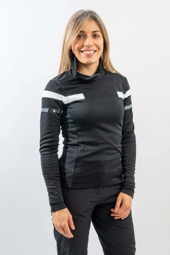 Sottotuta in tessuto elasticizzato e felpato. Zip sulla spalla. Impreziosito dal logo in strass e movimentato da strisce in contrasto di colore che dal petto proseguono sulla manica. Morbido e caldo è adatto a tutti gli sport all’aria aperta.